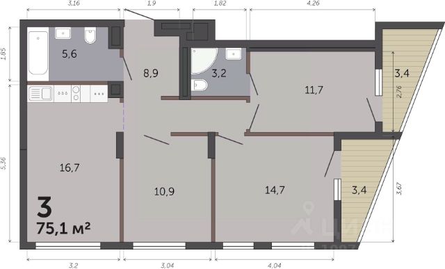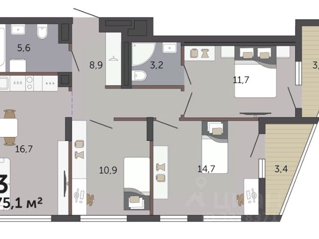 Продаётся 3-комнатная квартира в строящемся доме (Дом 6), срок сдачи: III-кв. 2027, общей площадью 75.1 кв.м., на 8 этаже. Расположение, транспортная доступность