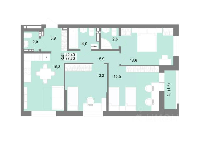 Вместительная прихожая, наполненная системой хранения в виде шкафов "Командор". Просторная кухня с панорамными окнами и кухонным гарнитуром из натурального дерева разделена дверью с уютной гостиной в классическом стиле, общей площадью 37,8 кв.м. Две спальни 17 и 20,5 кв.м. Их объединяет продуманная до мелочей гардеробная от "Командор", а так же санузел с ванной. Второй санузел с душевой кабиной расположен рядом с кухней - гостиной, что очень удобно.