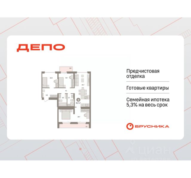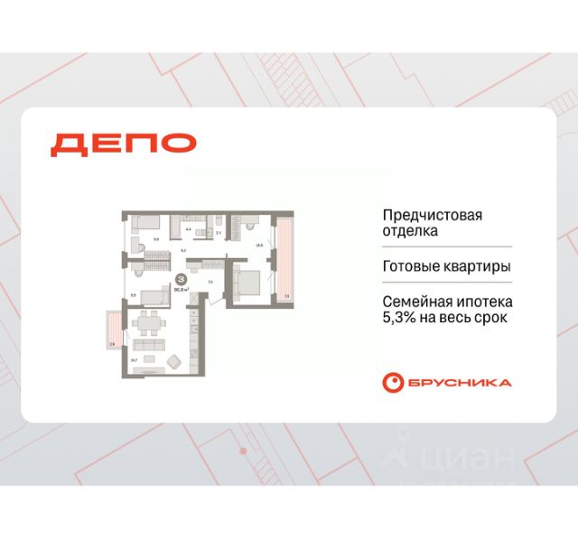 Успейте забронировать по акционной цене! Срок предложения ограничен! Стоимость квартиры указана со скидкой, ваша экономия составит 350,000 RUB. Информация по телефону, мы вам все подробно расскажем! Просторная 3-комн. квартира с европланировкой и предчистовой отделкой в ЖК "Квартал Траектория" на 9 этаже. Общая площадь: 73.6 кв.м., жилая: 43.3 кв.м., общая площадь гостиной-столовой с кухонной зоной: 26.6 кв.м. Европейская планировка, за счет большой площади кухни-гостиной квартира выглядит просторной и очень удобна для жизни. Комнаты изолированные, все окна выходят на одну сторону. В квартире одна лоджия, два совмещенных санузла. Высота потолков 2.82 м. Дом монолитный, многоподъездный, переменной этажности, от 7 до 16 этажей. Квартира находится в 4-й секции высотой 16 этажей в корпусе 1-2. На этаже 7 квартир. В подъезде 1 пассажирский и 1 грузовой лифт. Начало строительства - 4 квартал 2025 года. Окончание строительства - 4 квартал 2027 года. Оформление сделки по договору долевого участия. Квартира с кухней-гостиной и тремя спальнями в квартале "Траектория". Особенности планировки: лоджия, разнесённые спальни, предчистовая отделка, мастер-спальня. квартиры в нашей базе: МНВ01-Ж12.9.5. Квартал "Траектория" строится в границах улиц Билимбаевской, Расточной, Монтажников и Маневровой Раньше здесь находился оборонный завод 5-ЦАРЗ, основанный в 1945 году. После войны он ремонтировал военную и грузовую технику — от "Виллисов" и "Студебекеров" до советских ЗИС-5 и ГАЗ-67. Сортировка — район с развитой инфраструктурой, обжитыми жилыми кварталами разных эпох и большим количеством парков. До центра Екатеринбурга — 20 минут на машине. Туда же можно отправиться на автобусе: ближайшая остановка общественного транспорта — в 4 минутах от "Траектории". Рядом с "Траекторией" расположены магазины, торговый центр, детские сады, школы, поликлиники и полезные сервисы, а также другой проект Брусники — квартал "Депо". Если хочется развлечений, можно отправиться в ТРЦ "Карнавал" и парк с аттракционами "Таганская слобода" — дорога туда займёт не более 10 минут на машине. Квартал "Траектория" — первый этап комплексного развития территории, которую раньше занимали производственные здания. На месте бывших цехов Брусника создаст дружелюбную среду и комфортное пешеходное пространство для всего района. Для озеленения квартала мы подобрали больше 60 видов растений: ольху, липу, клён, иву, грушу, вишню, сирень, барбарис, гортензию, смородину, ирис, декоративные травы. Они цветут в разное время года и постоянно меняют настроение двора. В "Траектории" мы предусмотрели несколько общественных пространств, открытых для всех горожан: встречающий сквер, лесопарк у храма и событийный сквер между домами. Когда захочется тишины и уединения, можно устроить прогулку во внутренних дворах: в них нет машин и посторонних, зато много зелени, света и мест для отдыха. Каждый двор в квартале "Траектория" — продолжение квартиры, только под открытым небом. Здесь можно прогуля