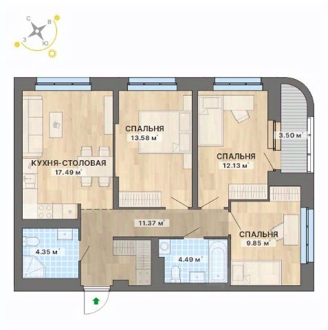 Квартира 4 в подъезде 1. Современные кварталы европейского типа в 5 минутах пешком от метро "Уралмаш". Садик в глубине квартала. Магазины и офисы у дома. Здание с кафе и благоустроенная площадь рядом с ним. Паркинг и уютный закрытый двор.