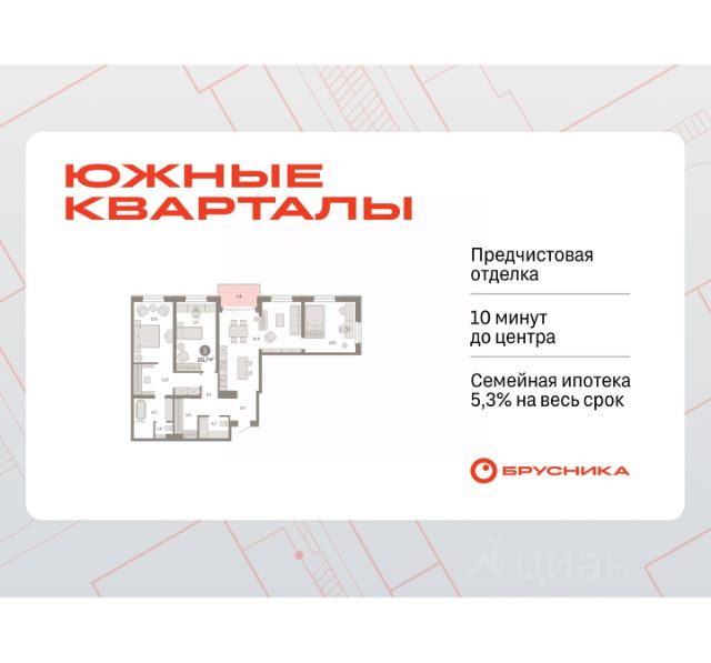Спешите оформить бронирование по этой цене! Предложение ограничено! Стоимость квартиры указана со скидкой, ваша экономия составит 650,000 RUB. По всем вопросам обращайтесь в офис продаж, мы вам все подробно расскажем! Квартира с кухней-гостиной и тремя спальнями в Южных кварталах. Особенности планировки: второй санузел, гардеробная, окна в пол, окно в санузле, панорамное остекление, разнесённые спальни, предчистовая отделка, мастер-спальня, балкон. квартиры в нашей базе: ЮК04-А1-6-6.10.1. Жилой район "Южные кварталы" расположен в границах улиц Московская, Шаумяна и Фурманова, недалеко от автовокзала. До центра города — 10 минут на автомобиле. До станции метро "Чкаловская" — 15 минут пешком. Рядом находится парк, школа олимпийского резерва, несколько гимназий, лицей, детские сады и городская больница. "Южные кварталы" — проект комплексного редевелопмента территории, разработанный архитекторами Брусники совместно с голландскими бюро. Он разделен на несколько частей, каждая из которых имеет свой характер. Вдоль оживленной Московской появятся более высокие и крупные дома. Профиль спокойной и очень зелёной Шаумяна сформируют кварталы среднеи этажности. В глубине района мы расположим урбан-виллы, чуть дальше — башни-доминанты. Последние будут играть роль визуальных акцентов и впоследствии станут символами этого места. Ближе к Фурманова мы организуем образовательный кластер. Его составят два детских сада на 300 и 325 мест и школа, рассчитанная на 1500 учеников. Школа будет иметь спортивную зону, которая станет доступна и жителям района. Свяжет территорию сеть общественных пространств. Её центральным звеном станет зелёный променад, проходящий сквозь весь район и соединяющий его с парком 50-летия ВЛКСМ. #ZMZbzm