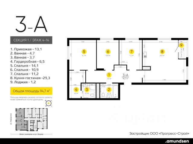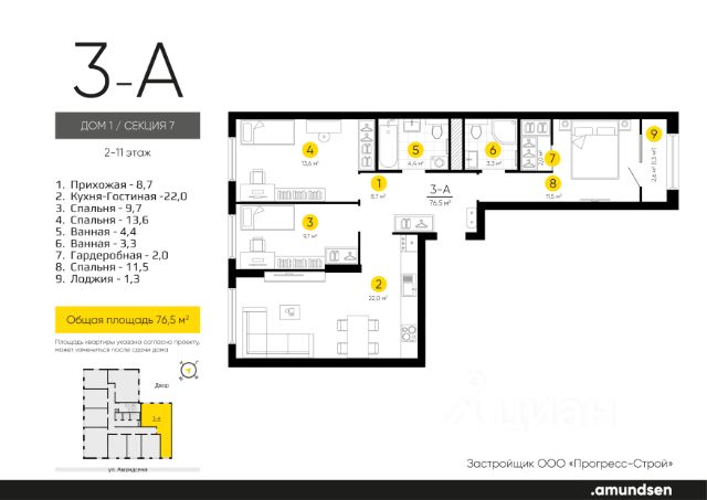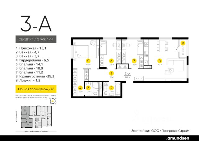 Жилой квартал "Amundsen" - для себя, для семьи, для жизни и развития. Авторская концепция проекта эффектно выделяется в 3 особенностях комплекса: фасады, двор и места общего пользования. AMUNDSEN ПРОЕКТ С ХАРАКТЕРОМ ВЕЛИКОГО ПЕРВООТКРЫВАТЕЛЯ. 4 СЕЗОНА: Двор-трансформер позволяет активно использовать все площадки круглый год. В холодное время года санки, коньки и снежные бои за главную башню. В теплое время источник наполняет двор водой и прохладой. Работают площадки для активных игр и спокойного отдыха. 6 ДЕТСКИХ ПЛОЩАДОК: Мы разделили площадки по возрастным группам для малышей и детей постарше. Качели, аттракционы, водные и активные игры созданы, чтобы познавать мир. 5 ПЛОЩАДОК ДЛЯ СПОКОЙНОГО ОТДЫХА: За счет игры с ландшафтом мы создали приватные зоны, украсили пространство разнотравьем, оживили двор источником. Шум воды, лежаки, беседки, парк места, где ты почувствуешь течение жизни. AMUNDSEN ИДЕАЛЬНОЕ МЕСТО ДЛЯ ЖИЗНИ И РАЗВИТИЯ. - Жилой квартал расположен в экологически чистом районе в окружении двух лесных массивов. - Новые современные школы и детские сады. Спортивный кластер для занятий. - Главный холл пространство для всех. Для самых маленьких игры, для взрослых кафе с ярким дизайном, тихий коворкинг, места для отдыха и светлый, просторный атриум. - Детские площадки "будущего" с оригинальным подходом к созданию игровой среды. - Безопасная территория. Круглосуточная охрана, видеонаблюдение 24/7, электронная система доступа, двор без машин. Застройщик ООО СЗ "Прогресс-Строй", проектная декларация на сайте наш.дом.рф