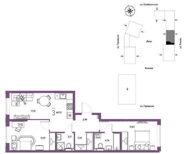 Квартал состоит из четырех 27-этажных домов. В домах — уютные студии, однокомнатные, двухкомнатные, семейные трехкомнатные квартиры. А для ценителей редких форматов квартиры с террасами. Парадный вестибюль с камином и кафе, двор с лаунж-зонами, фонтаном, сенсорным садом, детскими и спортивными площадками внутри.