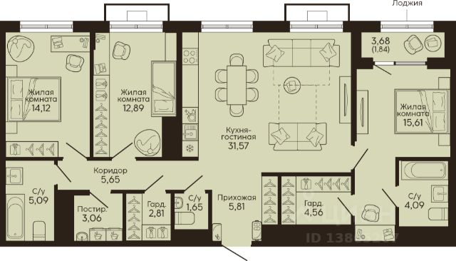 Oбщая площaдь квартиры 58,7 м2: просторная кухня-столовая - 20,2 м2, удобная спальня - 12,1 м2 с выходом на лоджию и большой гардеробной, коридор - 5 м2, совмещенный санузел - 4,3 м2.