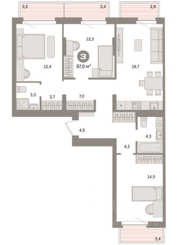 Квартира с кухней-гостиной и тремя спальнями в проекте Гоголя 21. Особенности планировки: свободная планировка.
