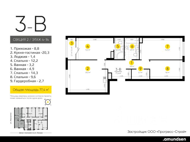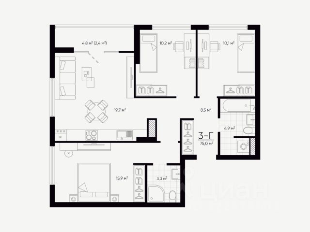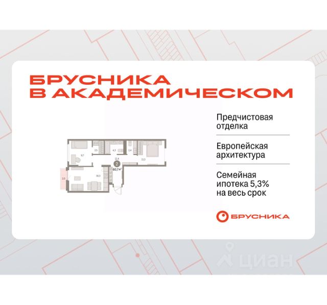 Квартира с кухней-гостиной и тремя спальнями в Бруснике в Академическом. Особенности планировки: второй санузел, вид во двор, разнесённые спальни, предчистовая отделка, мастер-спальня, постирочная, терраса на крыше.
