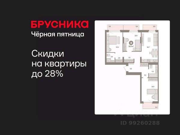 Квартира с кухней-гостиной и тремя спальнями в квартале "Депо". Особенности планировки: окна на две стороны, второй санузел, гардеробная, окна в пол, рабочий кабинет, вид во двор, панорамное остекление, предчистовая отделка, мастер-спальня, терраса, постирочная, балкон.