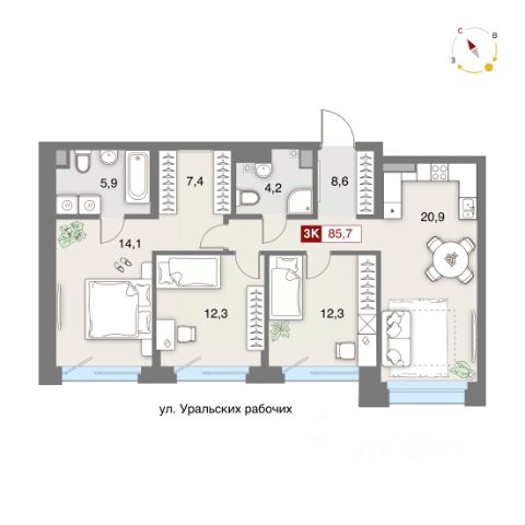 Жилой квартал "К100" на Космонавтов, 100 будет состоять из трех монолитно-кирпичных домов, объединенных общим двором. Застройщик компания "Практика". Планировки начинаются от 44,8 м² и доходят до 159,5 м². На каждом этаже располагается от восьми квартир классического и евроформата от двух до пяти комнат. Застройщик предлагает два вида отделки: white box и чистовую. Есть возможность перепланировки. Двор с ландшафтным озеленением разделен на три зоны. Для детей игровые площадки с меловыми досками и уличными шахматами, для взрослых лаунж-зона с креслами и столиками для отдыха, для спортсменов воркаут-площадка. На первом этаже лобби-клуб с игровыми комнатами, залом для йоги, коворкингом и мини-кинотеатром, колясочные и велосипедные помещения. Для автомобилистов предусмотрены гостевые места и подземный паркинг с доступом на лифте. На всей территории жилого комплекса установят видеонаблюдение. В доме будет работать консьерж-сервис в режиме 24/7. Дополнительные услуги включают клининг, выгул домашних животных, доставку еды из ресторанов и вызов такси. Также предусмотрена система "Умный дом". Рядом с жилым комплексом находятся сосновый бор, школы, детские сады, медицинские учреждения, торговые центры и супермаркеты, остановки общественного транспорта и станция метро. В шаговой доступности от дома откроется новый корпус уникальной гимназии "Арт-Этюд" — многопрофильного центра общего и художественного образования для детей от 3 до 18 лет. Строительство первой очереди жилого квартала "К100" на Космонавтов, 100 завершится в четвертом квартале 2026 года. Купить 3-комнатную квартиру с отделкой от застройщика в районе Орджоникидзевский в городе Екатеринбург.