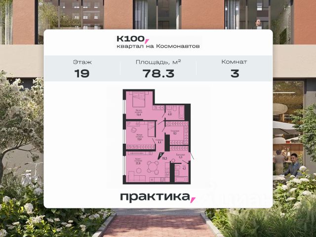 Жилой квартал "К100" на Космонавтов, 100 будет состоять из трех монолитно-кирпичных домов, объединенных общим двором. Застройщик компания "Практика". Планировки начинаются от 44,8 м² и доходят до 159,5 м². На каждом этаже располагается от восьми квартир классического и евроформата от двух до пяти комнат. Застройщик предлагает два вида отделки: white box и чистовую. Есть возможность перепланировки. Двор с ландшафтным озеленением разделен на три зоны. Для детей игровые площадки с меловыми досками и уличными шахматами, для взрослых лаунж-зона с креслами и столиками для отдыха, для спортсменов воркаут-площадка. На первом этаже лобби-клуб с игровыми комнатами, залом для йоги, коворкингом и мини-кинотеатром, колясочные и велосипедные помещения. Для автомобилистов предусмотрены гостевые места и подземный паркинг с доступом на лифте. На всей территории жилого комплекса установят видеонаблюдение. В доме будет работать консьерж-сервис в режиме 24/7. Дополнительные услуги включают клининг, выгул домашних животных, доставку еды из ресторанов и вызов такси. Также предусмотрена система "Умный дом". Рядом с жилым комплексом находятся сосновый бор, школы, детские сады, медицинские учреждения, торговые центры и супермаркеты, остановки общественного транспорта и станция метро. В шаговой доступности от дома откроется новый корпус уникальной гимназии "Арт-Этюд" — многопрофильного центра общего и художественного образования для детей от 3 до 18 лет. Строительство первой очереди жилого квартала "К100" на Космонавтов, 100 завершится в четвертом квартале 2026 года.
