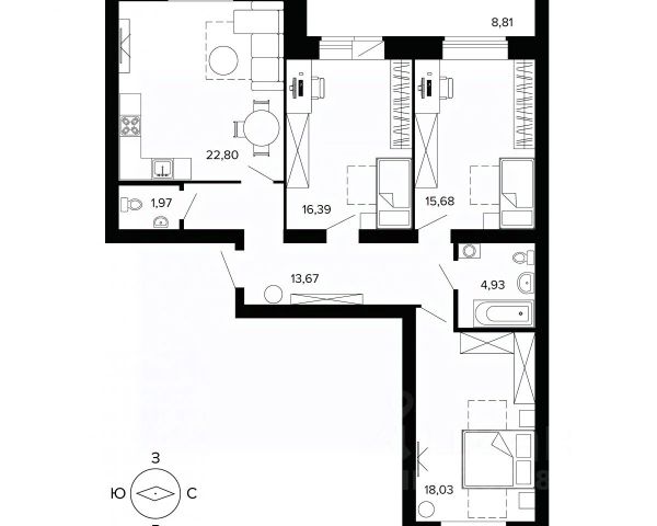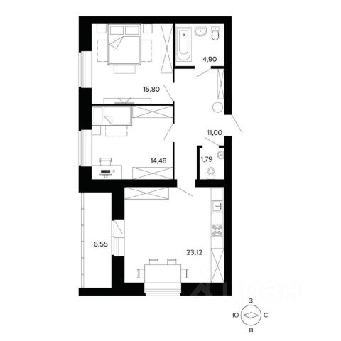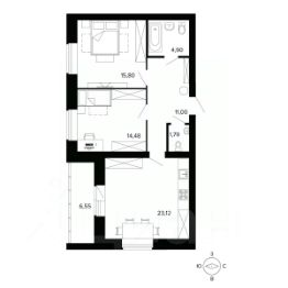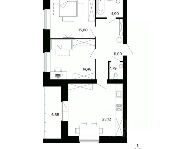 Кухня-гостиная позволяет размещать гостей, обустроить там игровую зону, либо зону отдыха. Спальни имеют достаточную площадь для размещения мест хранения, рабочей и приватной зоны.