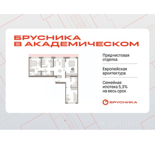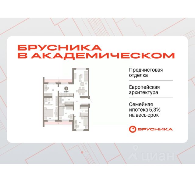 Успейте оформить бронирование по акционной цене! Предложение ограничено! Стоимость квартиры указана со скидкой, ваша экономия составит 2,120,000 RUB. По всем вопросам обращайтесь в офис продаж, наши менеджеры вам все расскажут! Продаётся с паркингом и кладовой. Квартира с кухней-гостиной и тремя спальнями в Бруснике в Академическом. Особенности планировки: второй санузел, вид во двор, разнесённые спальни, предчистовая отделка, мастер-спальня, постирочная, терраса на крыше. квартиры в нашей базе: АКД04-Ж8.8.3. Квартал "Брусника в Академическом" расположен в границах улиц Ландау — Новая. Сегодня Академический — молодой, стремительно развивающийся район, обеспеченный всей необходимой инфраструктурой. С центром его связывают две магистральные улицы — Вильгельма де Геннина и Амундсена. Последняя в перспективе соединится с ЕКАДом, что позволит жителям быстрее выезжать из города. Согласно утвержденному проекту планировки территории в пешеходной доступности от квартала Брусники появятся две школы, рассчитанные на 1700 мест, и шесть детских садов. Рядом со строящимися домами расположены две крупные зелёные зоны — Юго-Западный лесопарк и Преображенский парк. В школах раиона совместно с учеными УрО РАН будет реализован проект "Малая академия наук", предпогагающий регулярные экскурсии в отраслевые институты и лаборатории, участие в научных конференциях и мастер-классах. Также в Академическом уже построены, теннисная академия и дворец дзюдо, крупные ТРЦ "Краснолесье" и ТРЦ "Академический", гипермаркет "Лента", в планах — организация ИT-кластера и новых филиалов НИИ. Камерные дворы квартала закрыты от машин. По нашим стандартам 70% их территории покрывает зелень. Деревья, кустарники и травы подобраны таким образом, чтобы в каждый сезон двор оставался красивым и имел свой цвет. Каждый двор разделён на зоны. В одной расположены детские площадки, в другой — места для спорта и тихого отдыха взрослых. Особенность ландшафта дворов — дождевые сады, снижающие нагрузку на ливневую канализацию. Они впитывают сток с крыш и тротуаров, фильтруют его в специально подобранном субстрате и отправляют в пруд. #Z4D4Be Продается 3-комнатная квартира в микрорайоне Академический в городе Екатеринбург.