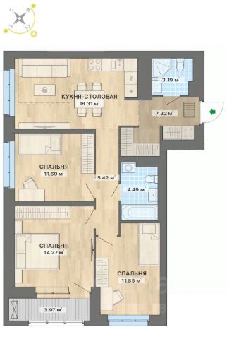 Три полноценные спальни - всем хватит места, чтобы разойтись по углам или, наоборот, собраться вместе за вкусным ужином в отдельной кухне.