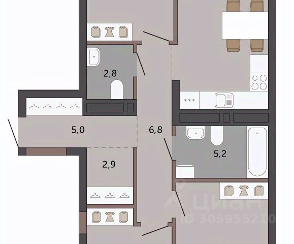 Квартира оборудована мебелью и техникой, все в едином современном стиле. В стоимость входит кухонная мебель с техникой, шкафы.