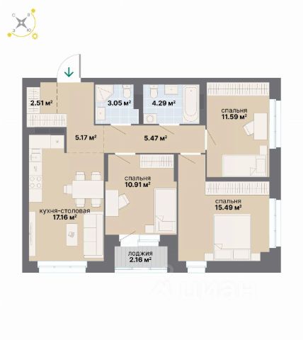 Планировка: кухня плавно переходящая в гостиную, совмещенный сан узел с ванной, 2 изолированных спальни, холл с кладовой комнатой, прихожей и шкафом-купе, 2 панорамных лоджии ( кухня и спальня).