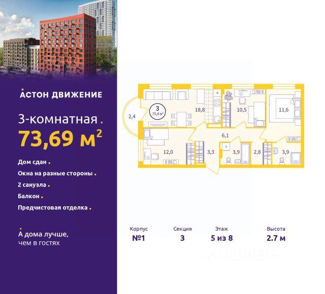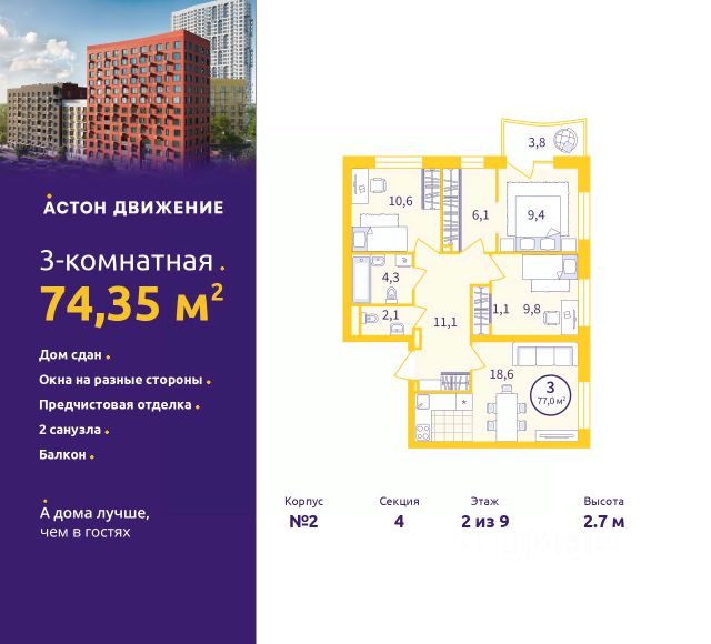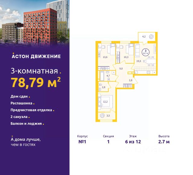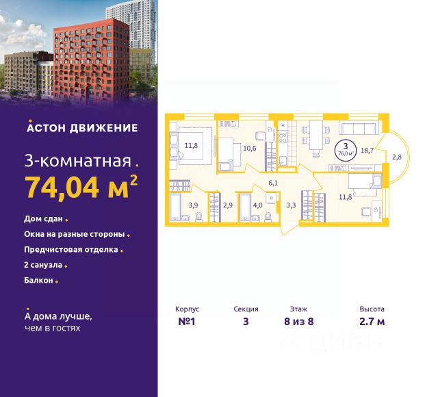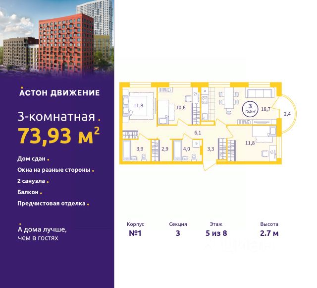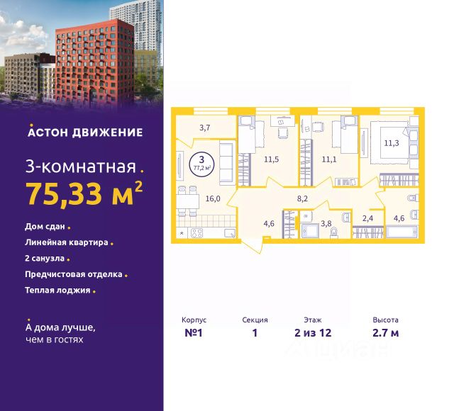Спешите оформить бронирование на этих условиях, срок предложения ограничен! Стоимость квартиры указана со скидкой, ваша экономия составит 2,540,000 руб. Звоните, наши менеджеры вам все расскажут. Продается трехкомнатная квартира от застройщика с предчистовой отделкой в ЖК "Астон.Движение" на 3 этаже. Общая площадь: 73.93 кв.м., жилая: 34.2 кв.м., площадь просторной кухни-столовой: 18.7 кв.м. Угловая квартира, идеально подойдет любителям тишины и панорамных видов. В квартире один балкон, два совмещенных санузла. Высота потолков 2.7 м. Отделка white box - золотая середина между чистовой и черновой отделкой. В вашей квартире будут выполнены работы: стяжка пола; выровнены и оштукатурены стены; затерты швы на потолке; электроразводка во всех помещениях; полностью готовая система отопления, водопровод и канализация; установлена входная металлическая сейф-дверь. Дом монолитный, трехподъездный, переменной этажности, от 8 до 12 этажей. Квартира находится в 3-й секции высотой 8 этажей в корпусе 1. На этаже 9 квартир. В подъезде 1 грузовой лифт. В настоящее время строительство завершено, дом сдан в 4 квартале 2025 года. Оформление сделки по договору купли-продажи. Квартал Астон.Движение расположен в развивающейся части Новой Сортировки, на пересечении улицы Пехотинцев и переулка Проходной. Первая очередь 6 домов разной этажности, детский сад и бульвар с прогулочными аллеями в окружении зелени. В архитектуре отдано предпочтение отдельно стоящим секциям, благодаря чему получилась большая вариативность планировок, много видовых квартир с окнами на разные стороны, а постепенный набор высоты домов позволит наполнить солнечным светом каждую квартиру. Первые этажи домов соединяет большая галерея товаров и услуг для жителей и гостей квартала. Двор обустроен для приятного и неспешного движения. Полностью закрытый, без доступа автомобилей, с плавными линиями прогулочных тропинок. Игровые площадки для малышей и ребят постарше находятся на отдалении друг от друга. А взрослым можно разместиться в уютных беседках, на скамейках со столиками в тени деревьев или заняться спортом в уличном воркауте. В холлы организован безопасный безбарьерный доступ: нет риска получить травму или оступиться. Просторные лобби с современной дизайнерской отделкой, ресепшен, кофе-пойнтами и мягкими зонами наполнены светом и воздухом. Чистовая отделка включает: • В комнатах, коридоре и кухне — ламинат 32 класса на звукоизоляционной подложке. В ванной — напольная керамическая плитка; • Стены покрыты обоями и окрашены. В ванной влагостойкая краска нейтрального цвета; • Потолки зашпаклёваны и окрашены; • Установлены глухие межкомнатные двери одной модели; • Сантехника — раковина, унитаз и ванна. #24d30w