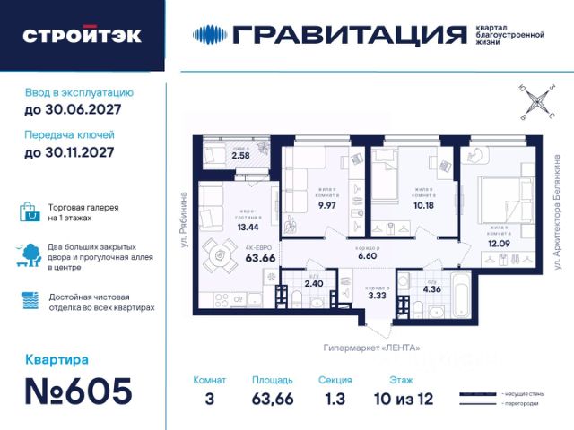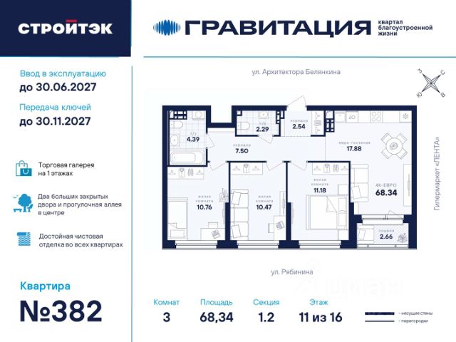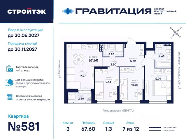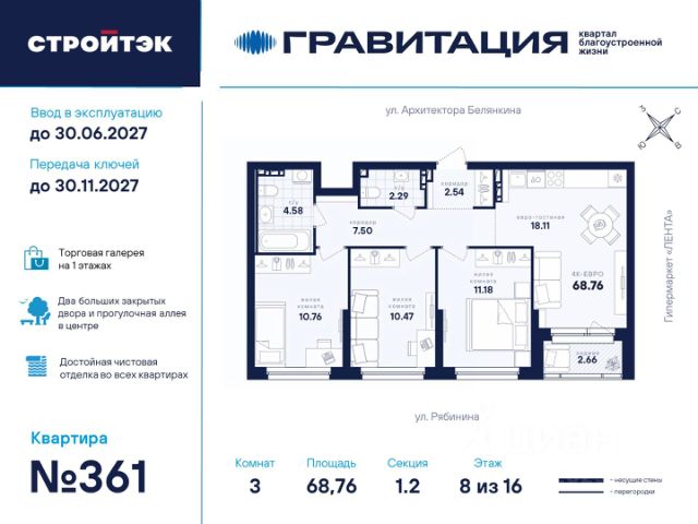 Удачные решения Новый квартал благоустроенной жизни "Гравитация" мы разместили в периметре улиц Рябинина и Академика Ландау. У квартала 5 этапов строительства, а всю работу мы завершим к 2030 году. Авторы проекта гармонично совместили в оформлении природные элементы и современный дизайн. Волнообразные очертания на стенах вдохновлены силой ветра и движением воды. Скруглённые углы подчеркивают элегантный силуэт, а контрастная палитра акцентов и контурная подсветка верхних этажей создают выразительный архитектурный образ. Первый этап строительства: — Секция 1.1 — 1 подъезд 26 этажей — Секция 1.2 — 2 подъезда 16 этажей — Секция 1.3 — 1 подъезд 12 этажей Здесь всё и сразу Гравитация — уютный и обособленный, и в то же время открытый и просторный квартал. Всё рядом: супермаркеты и парки, кино и рестораны, школы и сады. В нескольких шагах набережная реки Патрушихи. В квартале построят муниципальный детский сад на 200 мест, а на 5 этапе строительства мы возведём 6-уровневый надземный паркинг на 250 машин. На первых этажах домов для вас будет работать торговая галерея с магазинами, кафе и привычными бытовыми сервисами. В 1 этапе строительства 631 квартира. Своя вселенная Развитый Академический район удобен и молодым семьям, и школьникам, и состоявшимся профессионалам. Рядом большой Преображенский парк с озером и Юго-Западный лесопарк с Тропой здоровья. — 3 минуты до Гипер Ленты — 10 минут на машине до ТРЦ "Академический", 15 минут до ЕКАД, 25 до центра — 6 школ и 6 детских садов — Спортивные комплексы и клубы Wake up, Bright Fit и Юность Богатые возможности В квартале два просторных закрытых двора общей площадью 1,4 гектара. Один двор объединяет 1 и 2 этапы строительства, другой — 3, 4 и 5 этапы. Между дворами — камерная прогулочная аллея для неспешных вечеров или полуденного отдыха. Во дворе первого этапа — зелёные участки из хвойных деревьев, акцентных кустарников и травянистых многолетников, а также сеть дорожек, детская площадка с песочницей, аттракционами и геопластикой, настольный теннис и зона для зарядки. А для комфорта и безопасности — вечернее освещение, охрана и постоянное видеонаблюдение. Пространство с заботой В просторных светлых лобби Гравитации — интеллигентный дизайн, помещения для колясок, высокие витражи и комфортная мебель. Выходы сквозные, на улицу и во двор. Лифты грузоподъёмностью 1000 и 450 кг. Мы подготовили для вас 44 уникальных варианта продуманных планировок, в том числе с кухнями-гостиными, гардеробными и мастер-спальнями. Здесь нет бесполезных зон, зато есть где посидеть в семейном кругу и разместить всё для удобства и комфорта. Современные технологии Мы позаботились о достойной чистовой отделке, чтобы вы могли уделить время главному. — Виниловые обои на флизелиновой основе, окрашенные стены в санузлах и на лоджиях — Натяжные потолки везде, кроме лоджий, там — окрашенные — Прочный влагостойкий ламинат и керамическая плитка — Межкомнатные двери светлых тонов и сейф-дверь на входе — Эргономичное размещение розеток и выключателей
