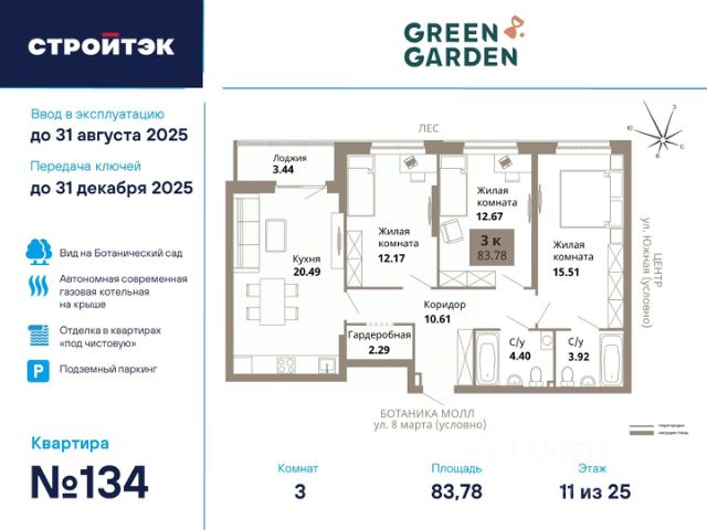 Жилой комплекс Грин Гарден расположен в микрорайоне Ботанический, в сердце Ботанического сада — по адресу 8 марта, 204е. Дом сдан. Продажа квартир осуществляется по договору купли-продажи от застройщика. Район Экологичный Ботанический микрорайон — один из самых молодых, и при этом развитых в городе. 100-летний Ботанический сад — прямо у дома 5 минут пешком до остановки транспорта 8 минут пешком до "Ботаники Молл" 10 минут на машине до центра города 2 км через парк — до метро "Ботаническая" 6 школ и 7 детсада поблизости Двор Кроме привычных элементов окружения, у дома — современная автономная газовая котельная на крыше — независимая, экономичная и безопасная. Концепция "Двор без машин", когда можно заехать только для разгрузки и погрузки Закрытая и освещённая территория без посторонних Круглосуточное видеонаблюдение Собственный сад с деревьями и кустарниками Детские и спортивные площадки, места для отдыха и мероприятий Подземный паркинг на 114 мест Подъезды Богатое и утончённое оформление холлов, удобная мягкая мебель, информативная навигация, стойка ресепшн и радушный консьерж. И это — не всё. Доступ в подъезд на уровне земли — без барьеров Домофон в тёплом остеклённом тамбуре 4 лифта, 2 из которых — грузовые Помещения для колясок и самокатов на 1 этаже Комната гигиены, чтобы помыть руки или лапы Планировки Обратите внимание на варианты с тёплыми лоджиями панорамного остекления, а также с террасами на первом этаже. В остальном — наш золотой стандарт — подход "Разумные метры". Объединённые кухни-гостиные для простора и общения Отказ от бесполезных зон Отделка В Грин Гарден мы предоставили вам свободу для творчества и выполнили отделку "под чистовую". На полу цементно-песчаная стяжка, на стенах — штукатурка, на потолках балконов — краска Усиленная сейф-дверь на входе в квартиру, на балконах и лоджиях — остекление В санузлах установлены унитазы, раковины и смесители, а во всей квартире — розетки и выключатели Радиаторы с терморегуляторами и горизонтальной разводкой Естественная вытяжка с механическим побуждением Двухкамерные стеклопакеты с приточными клапанами вентиляции Телеметрические счётчики на свет, тепло и воду