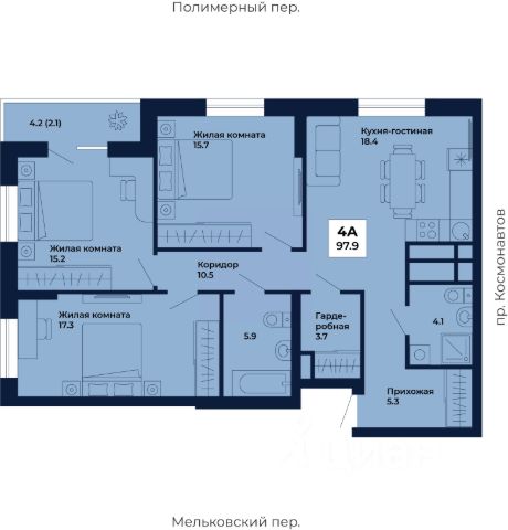 Продаётся 3-комнатная квартира в строящемся доме (Дом 8,9), срок сдачи: I-кв. 2029, общей площадью 99.1 кв.м., на 4 этаже. ЖК "Космос" - современный жилой квартал на проспекте Космонавтов 7, который строит ГК "Ривьера Инвест Екатеринбург". Жилой комплекс - это пять домов, благоустроенная территория комплекса и наземная парковка. Места общего пользования также выполнены в единой стилистике "космической" темы, используемой и в оформлении холлов, и дворов. Уют и тишина в случае с ЖК "Космос" сочетаются с хорошей инфраструктурой и легким доступом в центр. Отличительной чертой квартала будет аллея полувековых елей, насыщая его свежим воздухом и преображая внешний вид.