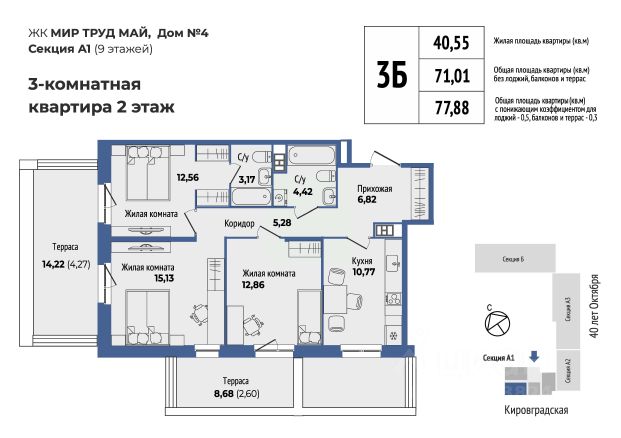Продаётся 3-комнатная квартира в сданном доме (40-летия Октября, 33 (Дом 4 секция А)), срок сдачи: II-кв. 2025, общей площадью 71.7 кв.м., на 8 этаже. Жилой комплекс "Мир Труд Май" - современные дома под лозунгом традиций. Уютный квартал в самом сердце Уралмаша - в квадрате улиц 40 лет Октября - Кировградская - Ломоносова - Калинина. Выполняется застройка разной этажности, которая состоит из четырех многоквартирных домов с частными дворами, подземным паркингом с кладовыми. Застройщик АСЦ "Правобережный" более 27 лет создает жилые пространства и продуманную инфраструктуру для родного города и области. Сейчас "Правобережный" строит жилой комплекс "Мир Труд Май" на Уралмаше, "Центральный" в Верхней Пышме и коттеджный поселок "Яснолетово". Комфортное жилье - это проектные решения, разработанные с учетом главных потребностей человека. В ЖК "Мир Труд Май" вы можете выбрать стандартную отделку в квартире "под чистовую" или дополнительно заказать отделку "под ключ". Квартиры с отделкой "под ключ" включают в себя: обои под окраску (без окраски), ламинат, установка сантехники и смесителей в одном из санузлов. Окна из ПВХ профиля с двухкамерным стеклопакетом и остекление лоджии. Современное инженерное оснащение включает в себя горизонтальную разводку системы отопления, установку приборов отопления с терморегуляторами, создание поквартирной системы учета с индивидуальными счетчиками учета тепла, электроэнергии и воды. Способы оплаты: • 100 % оплата • Ипотека • Материнский капитал • Рассрочка 0% • Трейд-ин Федеральный закон 214 гарантирует сохранность ваших средств. Деньги будут храниться на эскроу-счете — специальный счет, на который покупатель вносит деньги в банке, и банк их блокирует. Застройщик получает деньги только после завершения строительства объекта недвижимости.