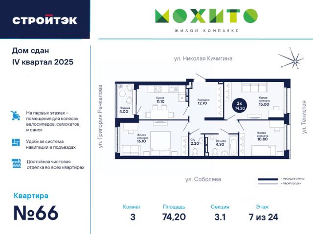 ЖК 'Мохито' — это квартал комфорт-класса, уютно расположенный в границах улиц Тенистая - Григория Речкалова - Николая Кичигина. Первая очередь ЖК 'Мохито' уже заселена, а вторая сдана в эксплуатацию в декабре 2025 года. Вторая очередь строительства дополняет и завершает облик ЖК. Дом состоит из двух секций в 24 этажа, которые объединяет между собой 8-этажный модуль. На первом этаже предусмотрены помещения для офисов. Академический район — один из самых молодых районов города Екатеринбурга. Прогрессивный подход к застройке, широкие улицы, транспортная доступность и богатая инфраструктура привлекает сюда новосёлов. Поблизости расположены 6 детских садов и 6 общеобразовательных школ. 4 спортивных клуба и 6 медицинских учреждений. 'Магнит' в 5 минутах пешком. Торгово-развлекательный центр 'Академический' всего в 5 минутах езды. Кольцевая автодорога в 10 минутах езды, а центр города — в 15 минутах. Во дворе для взрослых и детей - безопасные игровые площадки, футбольное и стритбольное поля, пикник-зона и шезлонги. Ухоженные дорожки среди деревьев и цветущих кустарников, скамейки и сад камней для прогулок. Подземная парковка на 87 автомобилей. Закрытый двор без посторонних и машин. Освещение внутренней территории. Круглосуточное видеонаблюдение. Комфортабельные подъезды Просторные холлы в 'Мохито' — пример современного подхода к организации общего пространства в многоквартирном доме. Сдержанные тона в отделке, аккуратные почтовые ящики, коллажи на стенах и информативная навигация — всё сделано для удобства жильцов. Безбарьерная среда. Застеклённые тамбуры. Вместительный лифт облегчит доставку груза до 1 тонны. Для колясок и инвентаря в подъездах предусмотрено отдельное помещение. В каждом подъезде понятная навигация — заметные надписи с указанием этажей и номеров квартир облегчат курьерам или гостям путь в ваш дом. В ЖК 'Мохито' предусмотрена стильная чистовая отделка: Пластиковые окна с двухкамерными стеклопакетами гарантируют теплосбережение зимой, а приточные клапаны вентиляции — поступление свежего воздуха летом. Установлены надёжная входная и стильные межкомнатные двери. На полу в прихожих, комнатах и кухнях уложен ламинат, а в уборных — керамическая плитка. Стены в санузлах окрашены, а также установлены раковины, смесители и унитазы. Стены комнат, кухонь и коридоров обклеены виниловыми обоями на флизелиновой основе. Розетки и выключатели расположены так, что ими удобно пользоваться. Радиаторы отопления с горизонтальной разводкой и терморегуляторами позволят установить комфортную температуру. На воду, электричество и тепло установлены телеметрические счётчики, а данные с них передаются автоматически.
