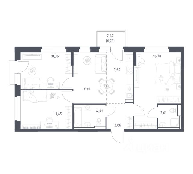 В продаже 3-комнатная квартира в корпусе 2 ЖК 'Пайер'. Квартира располагается на 4 этаже, общая площадь 67.56 м2.