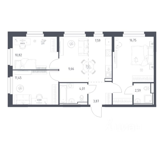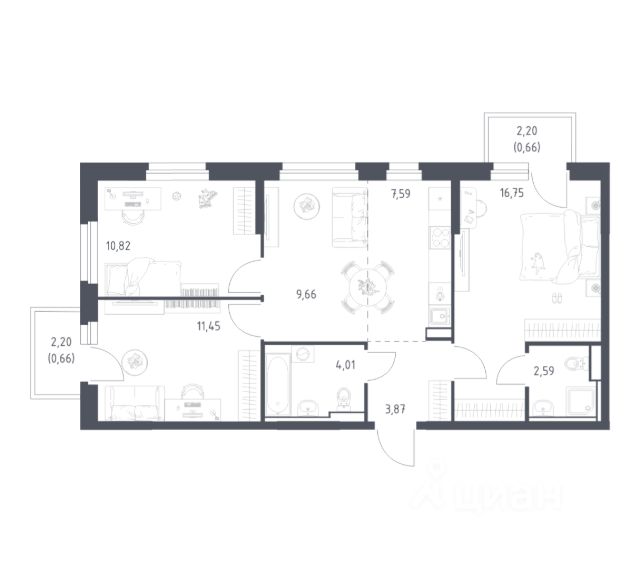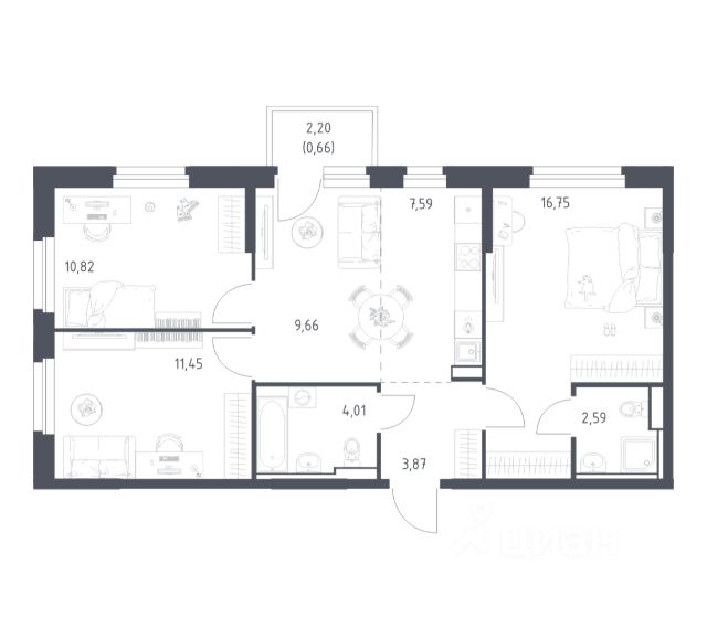 В продаже 3-комнатная квартира в корпусе 1 ЖК 'Пайер'. Квартира располагается на 10 этаже, общая площадь 66.74 м2.