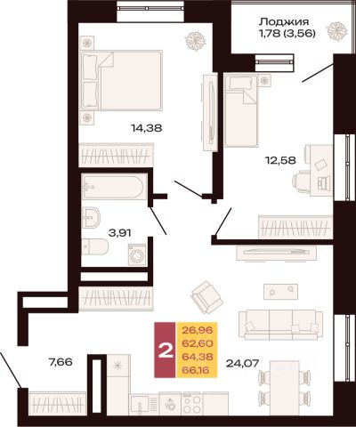 Квартира состоит из большой кухни-гостиной (23,4 метра), спальни, отдельной комнаты с шикарным видом на город, совмещенного сан-узла, просторного коридора и двух просторных лоджий.