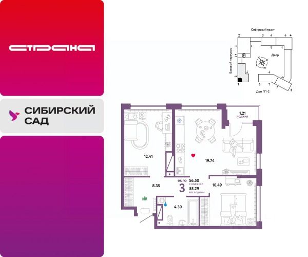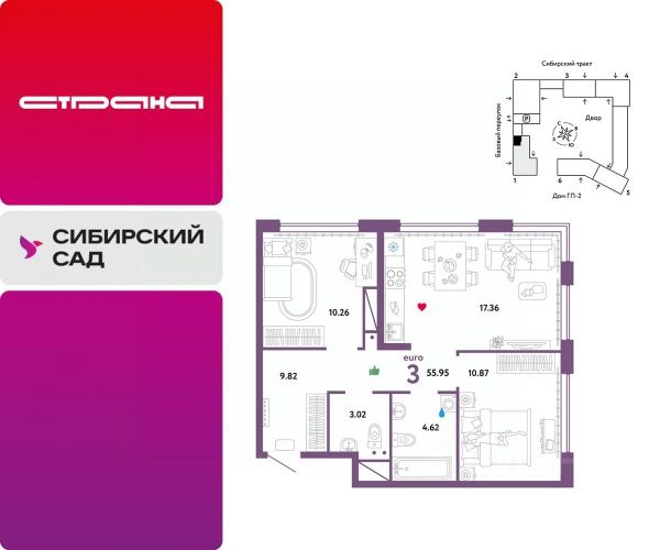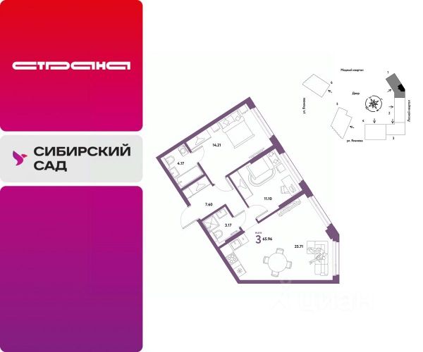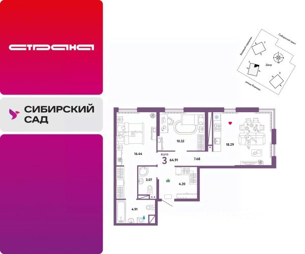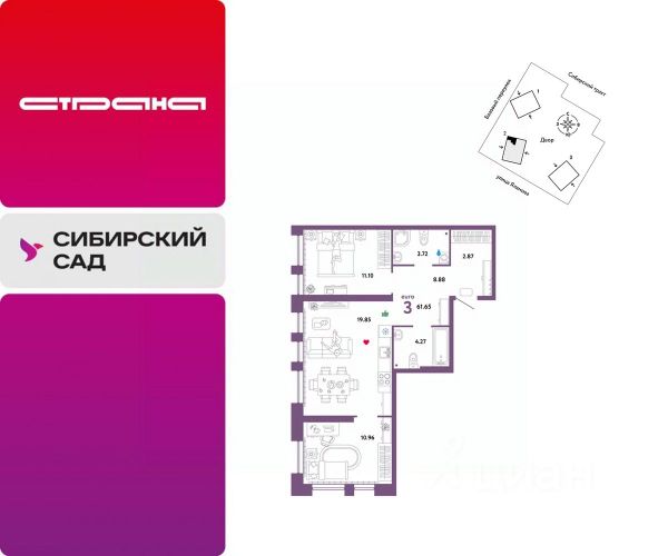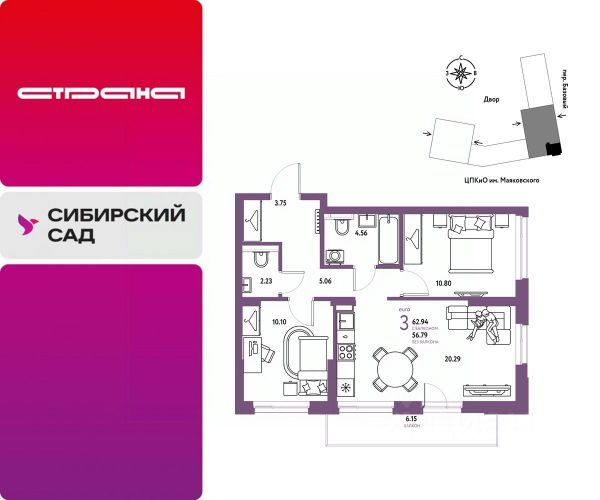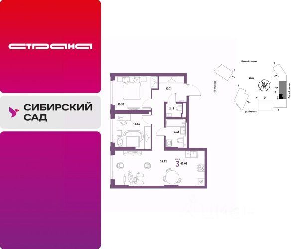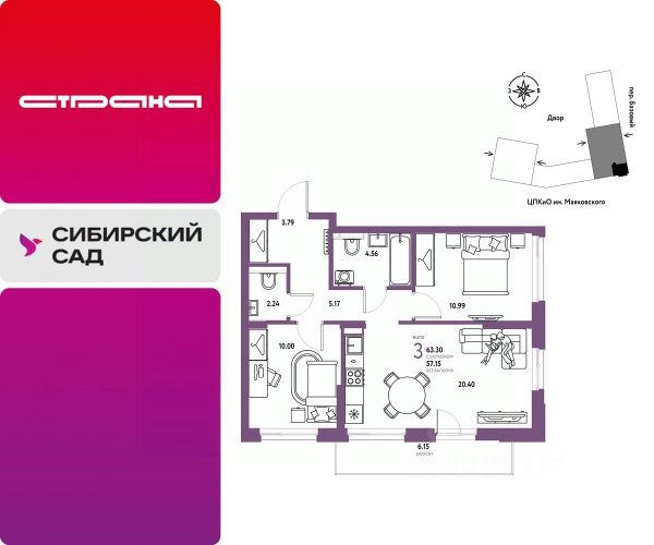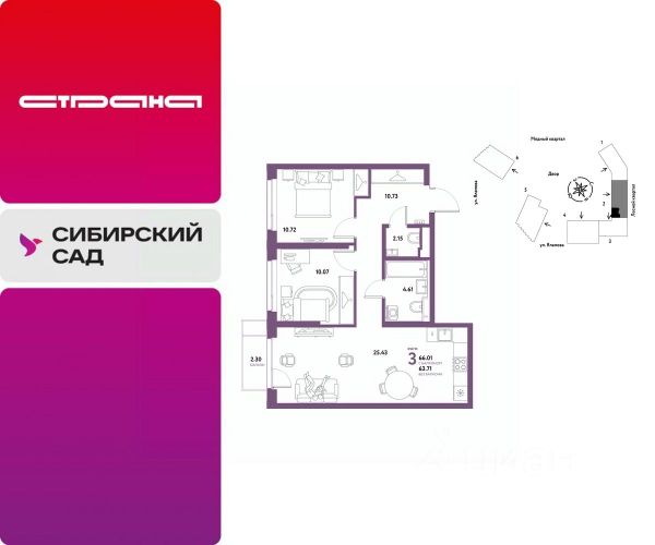 Новая квартира в ЖК "Сибирский сад" напрямую от федерального застройщика "Страна Девелопмент". Продается 3комнатная квартира на 3 этаже от застройщика Страна Девелопмент. Площадь квартиры 62,94 кв. м. Жилой комплекс "Сибирский сад" — первый проект от федерального застройщика "Страна Девелопмент" в Екатеринбурге. Квартал объединил в себе близость к природе и современному ритму жизни мегаполиса. Жителей ждёт живописный город-сад с приватными дворовыми территориями, большой пешеходный бульвар и собственный летний кинотеатр. Преимущества • Главная особенность жилого комплекса — огромный двор-сад с приватной территорией и собственным бульваром. Озеленение продумано с учётом сезонности растений. У каждого дома расположатся детские площадки, воркаут-зоны, арт-объекты и места для тихого отдыха. А для дополнительного комфорта входы во двор оборудованы системой FaceID. • В ЖК предусмотрен подземный паркинг на 333 машиноместа, в который можно попасть из любой секции, не выходя из дома. Сохранность автомобилей гарантирует охрана и круглосуточная система видеонаблюдения. • Сквозные парадные, спроектированные по принципу безбарьерной среды, с прозрачными входными группами обеспечивают естественное освещение и дополнительную безопасность. Все лобби выполнены по-индивидуальному дизайн-проекту. В каждом предусмотрены колясочные и велосипедные. Отделка Квартиры сдаются с предчистовой отделкой: произведена разводка электричества и отопления, выполнена стяжка пола, стены выровнены "под маяк", установлены радиаторы. Дизайнерская отделка При покупке квартиры в ЖК "Сердце Сибири" можно включить стоимость ремонта в ипотеку. 4 стиля отделки ванной и 5 стилей отделки комнат на выбор. Кухня от застройщика Одна из удобных опций от Страны — приобретение кухни в ипотеку при покупке опции "Ремонт". Доступно 4 стиля на выбор: дерево, керамика, мрамор, бетон. Умный дом Система "Умный дом" создаст новый уровень комфорта. Управление светом с помощью голоса, получение последней информации о ситуации в квартире во время отпуска или рабочего дня — и другие преимущества включены в пакет. Способы покупки Сотрудники "Страна Девелопмент" будут сопровождать вас на каждом этапе сделки, помогут получить одобрение по ипотеке или снизить ежемесячный платеж. - ипотека - рассрочка - с использованием материнского капитала -100% оплата наличными