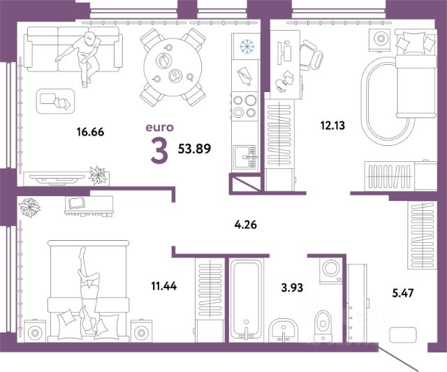 Общая площадь квартиры 53,7 кв. м.: спальня - 14,7 кв. м., гостиная и кухня - 25,6 кв. м., коридор - 7,4 кв. м., ванная - 4,3 кв. м., санузел - 1,5 кв. м.