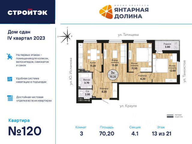Жилой квартал "Янтарная долина" расположен в районе Новый Виз, вблизи Верх-Исетского пруда. Предлагаем вам 374 квартиры в пятой очереди строительства — секциях 4.1-4.4. Это дом переменной этажности от 9 до 21 этажа по адресу улица Крауля, 170а. Дом сдан. Продажа от застройщика по договору купли-продажи. Район В Новом Визе городской комфорт сочетается с зелёной природой. Это одно из самых перспективных направлений в Екатеринбурге. 5 минут пешком до остановки транспорта 5 школ и 4 детсада поблизости 10 минут хода до набережной Верх-Исетского пруда 15 минут на машине до центра города 16 минут на машине до "МЕГИ" Двор В центре жилого квартала — двор для насыщенной жизни, игр и отдыха. Концепция "Двор без машин", когда можно заехать только для разгрузки и погрузки Детские площадки для разного возраста, футбол и уличный баскетбол Закрытая территория с пропускной системой и без посторонних Круглосуточное видеонаблюдение и освещение территории Подъезды Подъезд в "Янтарной долине" — яркое и светлое пространство, от которого становится приятно. Доступ в подъезды на уровне земли — без барьеров Домофоны в тёплых остеклённых тамбурах Вместительные грузопассажирские лифты во всех секциях Помещения для колясок и самокатов на 1 этаже Удобная навигация с номерами этажей и квартир Планировки Наш подход к проектированию квартир называется "Разумные метры". Это значит не только исходить из площади, но и учитывать число жильцов и их потребности. Объединённые кухни-гостиные для простора и общения В зависимости от вашего стиля жизни — по несколько вариантов планировок, от студий до 3-комнатных Отказ от бесполезных "мёртвых" зон 52 вида уникальных планировок Отделка В каждой квартире "Янтарной долины" мы позаботились о чистовой отделке, чтобы ваш переезд прошёл быстро и не вызвал лишних хлопот. Прочный водостойкий ламинат на полу в комнатах, прихожих и кухнях, плитка в санузлах, на стенах виниловые обои на флизелиновой основе, белые натяжные потолки Межкомнатные двери светлых тонов и сейф-дверь на входе в квартиру В санузлах установлены раковины и унитазы, а во всей квартире — розетки и выключатели Радиаторы с терморегуляторами и горизонтальной разводкой, двухкамерные стеклопакеты с приточными клапанами вентиляции Телеметрические счётчики на свет, тепло и воду