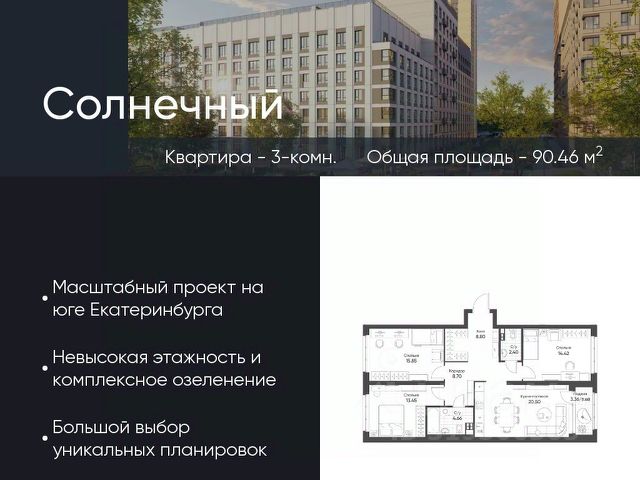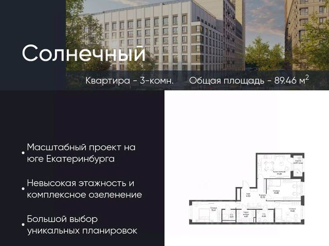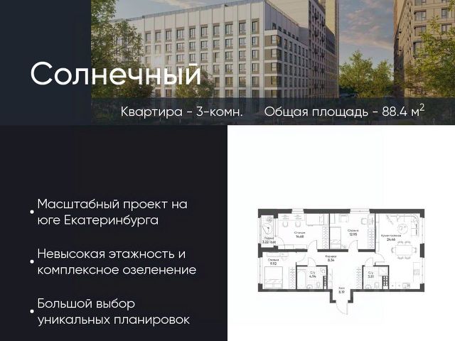 Продается квартира 536, по адресу Свердловская обл., г. Екатеринбург, Чкаловский район, корпус Солнечный, блок 5.4, корпус 2 в Солнечный на 7 этаже, с площадью 88.4 м2.