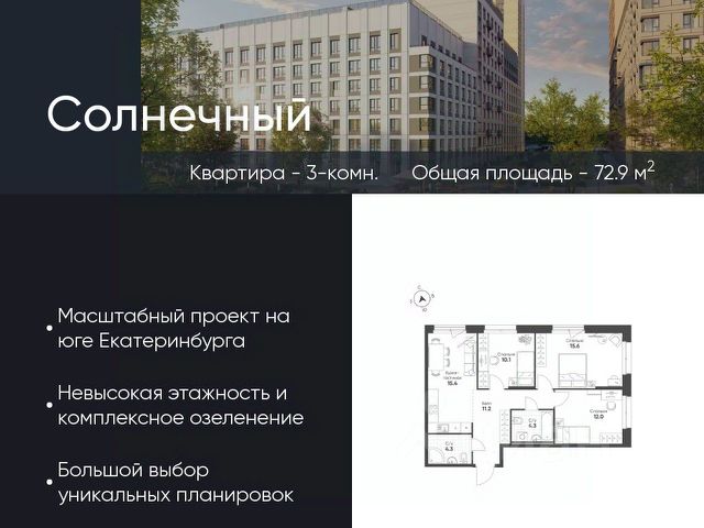 Продается квартира 402, по адресу Свердловская область, г. Екатеринбург, корпус Солнечный, блок 6.4 в Солнечный на 5 этаже, с площадью 73.1 м2.