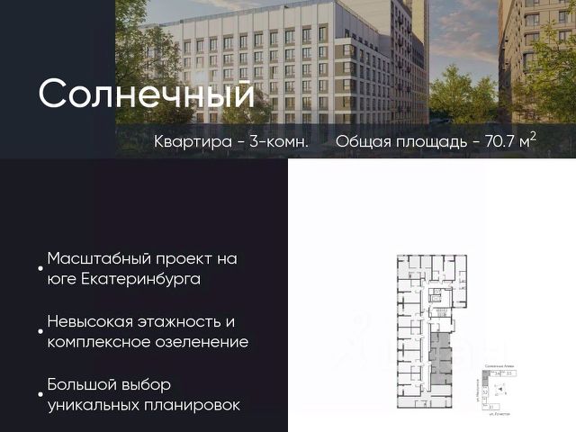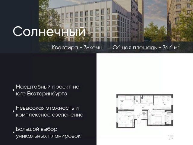 Продается квартира 660, по адресу Свердловская область, г. Екатеринбург, корпус Солнечный, блок 6.4 в Солнечный на 7 этаже, с площадью 76.6 м2.