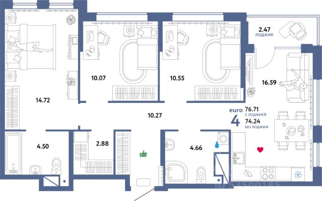 Квартира с дизайнерским ремонтом, имеет функциональную планировку, современного формата (евро4), кухня-гостиная, три изолированные комнаты, два раздельных сан узла и собственная гардеробная, и хозяйственная комната.