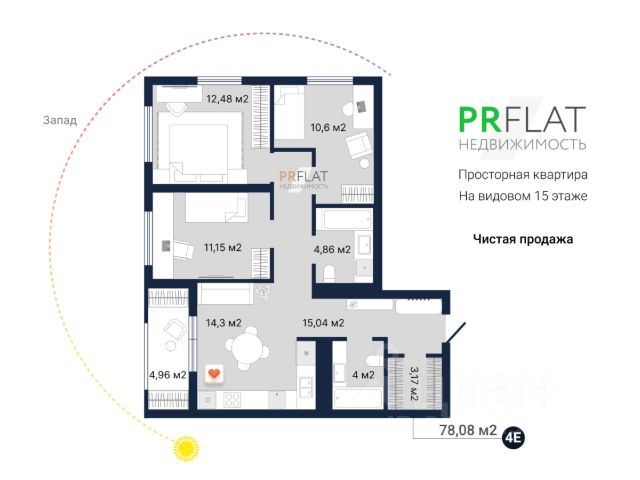 Экслюзивное предложение, звоните! В чистой продаже просторная функциональная 4Е квартира по адресу ул. Мологвардейцев, дом 1 (ЖК М1, микрорайон Уктус). Квартира общей площадью 78 кв. м с учетом лоджии: большая кухня-гостиная - 29,34 кв. м с выходом на лоджию 5 кв. м, три светлых спальни - 10,6 кв. м, 11,15 кв. м и 12,5 кв. м, удобный коридор (15 кв. м) с гардеробной - 3,2 кв. м, а также две ванные комнаты оптимальных размеров - 4 кв. м и 4,86 кв. м. Отделка - под чистовую, можно воплотить в жизнь все желаемые дизайнерские идеи Окна на две стороны - юго-запад и северо-запад. Расположена квартира на видовом 15 этаже, из окон открывается панорама на район, включая Нижне-Исетский пруд. В доме комфортные современные подъезды. Есть подземный паркинг. ЖК М1 - комплекс комфорт-класса, сдан во втором квартале 2025 года. Дом расположен в микрорайоне с развитой социальной и общественной инфраструктурой. В шаговой доступности: супермаркеты, магазины, кофейни, Жизньмарт, а также школа 300 (ДЮСШ Старт, студия иностранных языков) и детский сад 16. Рядом - набережная Нижне-Исетского пруда. Остановки общественного транспорта - в нескольких минутах ходьбы. Оформление: чистая продажа, квартира без обременений, продается по договору купли-продажи. Быстрый выход на сделку, возможна ипотека на вторичку любого банка, предоставим скидку - 0,3% по ипотеке Сбера. С удовольствием рассмотрим покупателя со 100% оплатой или ипотекой любого банка с первоначальным взносом. Покупка данной квартиры от РR FLАТ недвижимость даёт ряд преимуществ: + одобрение ипотеки под этот объект - оперативно и бесплатно; + электронная регистрация сделки в офисе агентства; + комфортное и внимательное сопровождение сделки; + РR FLАТ недвижимость - надежный партнер Уральской палаты недвижимости. !Если вы владелец недвижимости - обращайтесь к нам, также достойно представим, прорекламируем и выгодно продадим ваш объект! /Коллеги риэлторы и другие пользователи Циан, просьба не копировать авторское описание объекта, а также фото и планировку. Материалы созданы нашей компанией и согласно закону: авторское право в сети интернет защищает любые виды контента - тексты, изображения, фото, дизайн, графику/ Реальное предложение), запись на просмотр по телефону в объявлении, звоните!