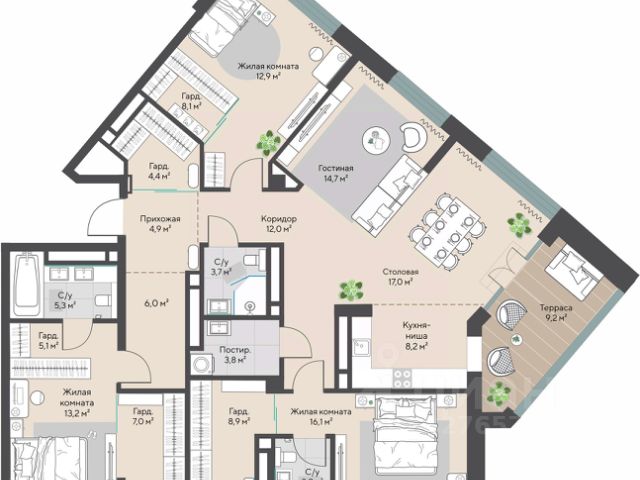 В квартире выполнен авторский ремонт с использованием натурального камня, дерева и сложного многоуровневого освещения. Продуманная планировка объединяет зоны, не теряя при этом камерности и функциональности. Интерьер выдержан в сдержанной эстетике современного премиума: фактуры создают глубину, линии — ритм, а материалы — ощущение основательности семейного дома. Установлена приточно-вытяжная система вентиляции с кондиционированием и увлажнением.