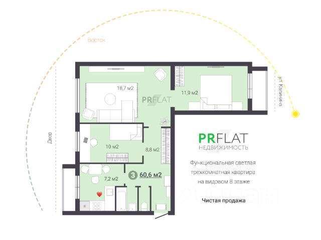 Вид из окон: Окна выходят во двор и на внутренний зелёный дворик — тихо, спокойно, без шума с улицы