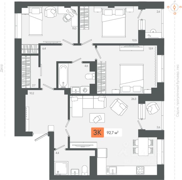Кухня-гостиная позволяет размещать гостей, обустроить там игровую зону, либо зону отдыха. Спальни имеют достаточную площадь для размещения мест хранения, рабочей и приватной зоны.