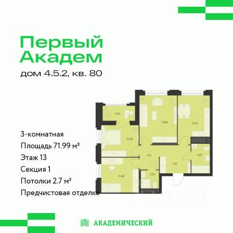 Проект от основателя и главного застройщика Академического района. Расположение и инфраструктура: Квартал "Первый Академ" включает восемь блоков домов, две школы и четыре детских сада в периметре улиц Краснолесья А. Мехренцева Ак. Вонсовского Очеретина. Сроки строительства квартала: 1 квартал 2023 3 квартал 2028. В числе особых преимуществ близость к Юго-западному лесопарку и ТРЦ "Академический": магазины, кафе, парк развлечений, кинотеатр, фитнесс-центр с бассейном. Развитая транспортная развязка, включающая трамвайную линию. На территории квартала планируется: видеонаблюдение 24/7, подземный паркинг с доступом на лифте, кладовые, велодорожки, многоуровневое озеленение, workout зоны для уличного фитнеса, детские игровые комплексы в эко-стиле. На первых этажах будут располагаться торговые галереи.