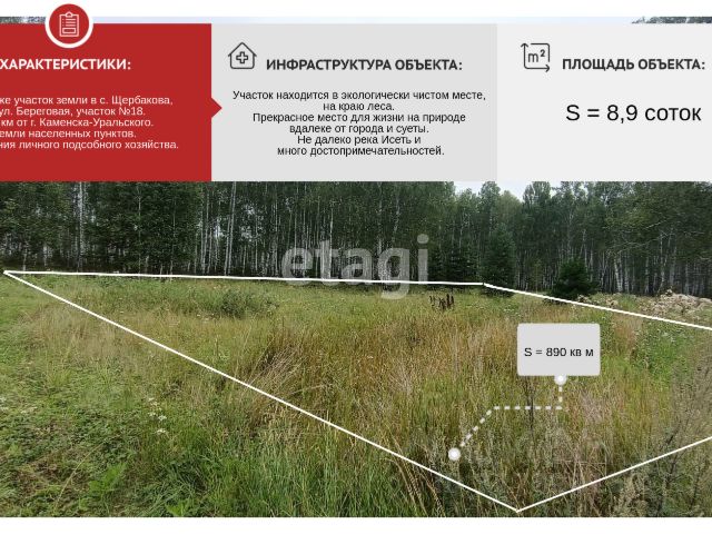 В продаже участок земли в с. Щербакова, по ул. Береговая, участок 18. В 13 км от г. Каменска-Уральского. Земли населенных пунктов. Для ведения личного подсобного хозяйства. 8,9 соток. Рядом в продаже еще 2 участка 20 (9,3 сотки) и 22 (9,2 сотки). Участок находится в экологически чистом месте, на краю леса. Прекрасное место для жизни на природе вдалеке от города и суеты. Не далеко река Исеть и много достопримечательностей. Земельный участок в аренде на 20 лет, до 2043 года. Звоните, отвечу на все вопросы и договоримся о просмотре. Код пользователя: 167246 Номер в базе: 9505377