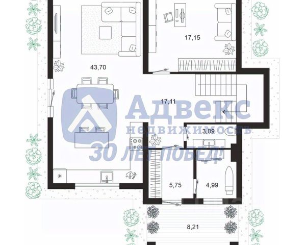 большая кухня-гостиная 43,7 кв.м. - идеальное место для семейных посиделок, из которой организован выход на террасу.