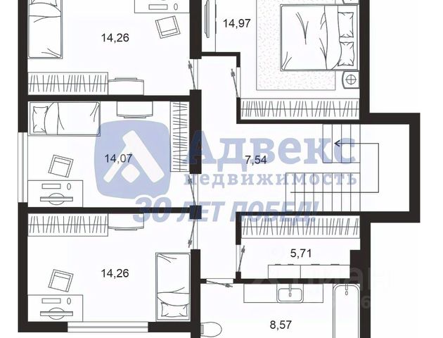 четыре уютные комнаты правильной геометрической формы площадью 14,97 кв.м., 14,26 кв.м., 14,07 кв.м. и 14,26 кв.м., что обеспечит личное пространство для детей и родителей. Из окон комнат полноценно просматривается игровая зона и искусственный водоем.