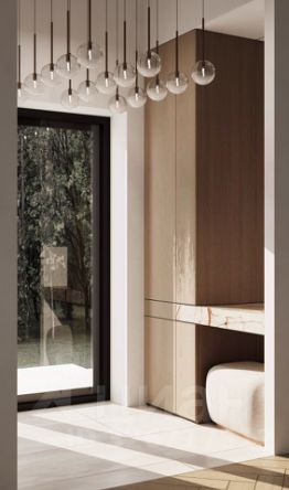 В меблировке используются натуральный шпон и камень, в отделке санузлов — крупноформатный керамогранит. В доме устанавливается вся необходимая бытовая техника. Во всех комнатах — теплые полы, а умная система сама поддерживает идеальный климат круглый год.