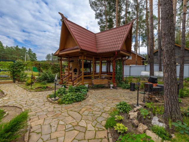 Беседка оборудована кухонным гарнитуром из массива дерева с встроенной стеклокерамической панелью, выведен водопровод, имеется русская печь. Для приема гостей установлен привезенный и изготовленный на заказ из карельской березы столовый гарнитур (обеденный стол, стулья и лавочка для отдыха). Беседка и дом на монолитной плите(350мм), пол из лиственницы, строение из сосны. При строительстве производился расчет по розе ветров и исходя из этого определялось месторасположение строений, поэтому в жаркий период в беседке всегда комфортно и не жарко. Для более холодного времени года установлен инфракрасный обогреватель, с задачей обогрева справляется отлично - в беседке даже жарко становится. Над беседкой имеется мансардный этаж, который можно использовать в летний период для ночлега либо использовать как склад. Рядом с беседкой оборудована мангальная зона, состоящая из нескольких жаровен: — это мангал, изготовленный на заказ из 10мм стали, тандыр и восстановленная чугунная печь (антиквариат)с сохраненным клеймом завода. Для удобного хранения шампуров изготовлена подставка из металла. Все предметы, бытовая техника и мебель - подарок покупателю.