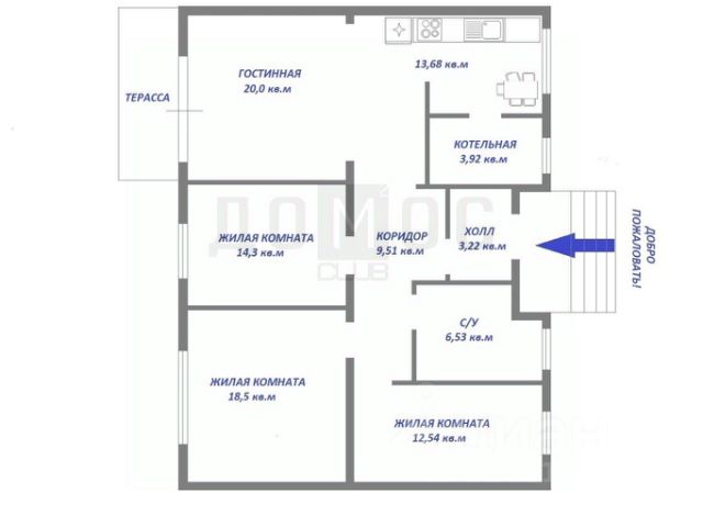 Главной особенностью планировки является разделение дома на 3 зоны: