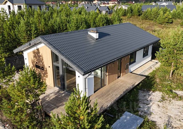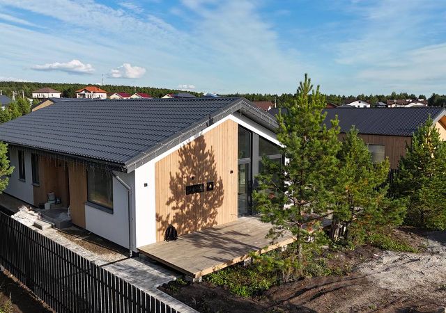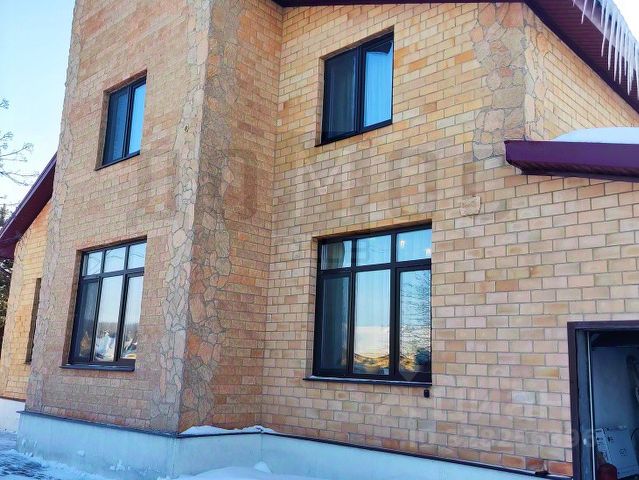 Дом построен из качественных материалов, на монолитном бетонном фундаменте, защищенном отмосткой по периметру дома. Фундамент по периметру отделан серым декоративным кирпичом, что гармонично контрастирует с общим фасадом. Обустроена наружная водосточная система. Фасад отделан светлой, фактурной штукатуркой "ручеек" со вставками из декоративного кирпича бежево-серого цвета в сочетании с оконными рамами серого цвета, что делает его практичным и оригинальным. Крыльцо располагается под отдельной крышей и оборудовано ступенями. Крыша дома покрыта серой металлочерепицей — все эти элементы вместе придают дому стильный и современный внешний вид. В комнатах и сан. узлах оборудованы вентиляционные клапаны, что обеспечивает приток свежего воздуха с улицы. Оборудована система климат контроля. Во всех комнатах установлены радиаторы как доп. источники отопления. Просторная терраса также располагается под общей крышей дома, ее основание выполнено из бетона и облицовано плиткой, оборудованы ступени для удобства спуска и подъёма. Терраса обрамлена тремя колоннами, отделанными декоративным кирпичом тёмно - серого цвета - изюминка фасада. Конек крыши здесь декорирован брусом.