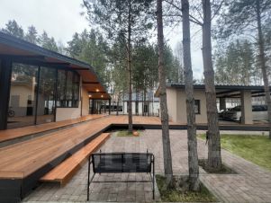 Терраса при входе 16 м2 освещается тремя светильниками с сумеречным датчиком включения-выключения. Отделка пола - гранит термообработанный.