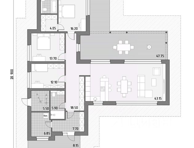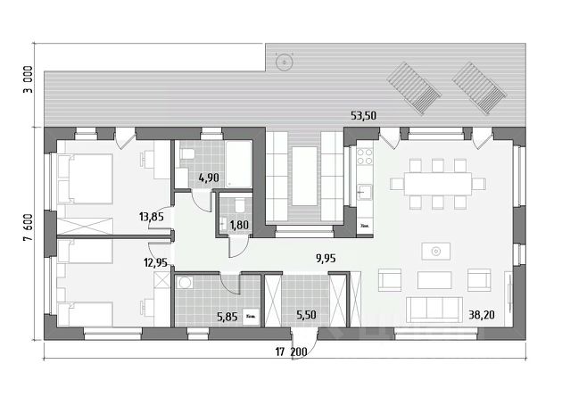 - На первом этаже вас встретит просторная большая комната, уютная кухня, аккуратная прихожая и современная ванная комната.