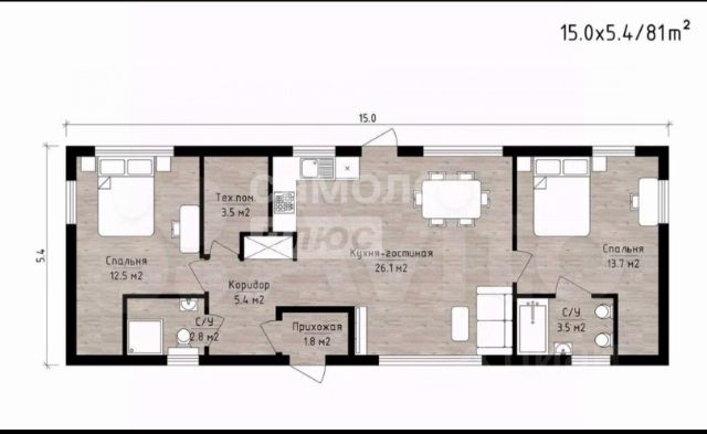 На первом этаже дома расположены вместительный холл, котельная, с/у, и огромная кухня-гостиная-столовая со вторым светом и выделенными зонами для комфортного отдыха, приятной семейной трапезы и удобной готовки.