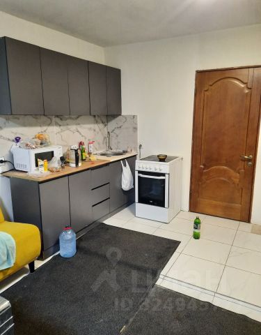 Кухня-гостиная с кухонным гарнитуром, который остается новым хозяевам, светлая комната для гостей с теплыми полами на два окна.